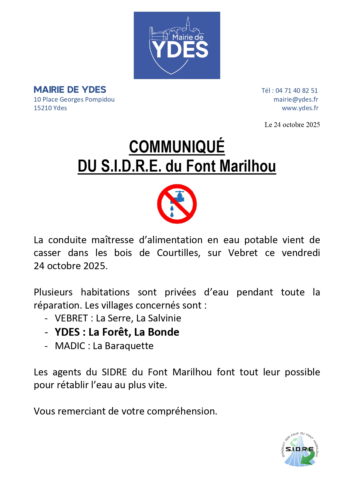 Communiqué du SIDRE - COUPURE EAU ce 24 octobre 2025 à LA FORET et LA BONDE