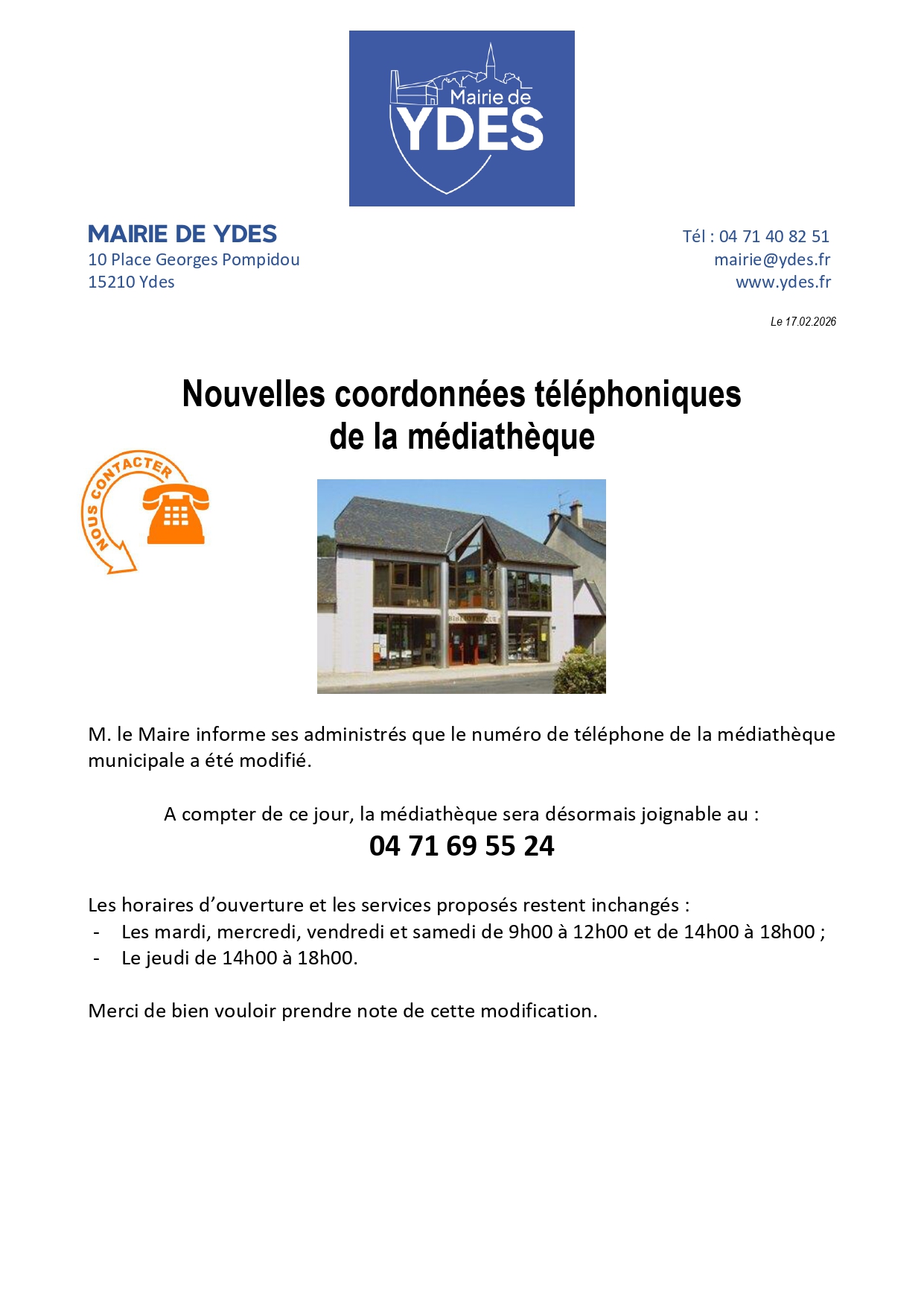 Nouveau Numéro de Téléphone de la Médiathèque